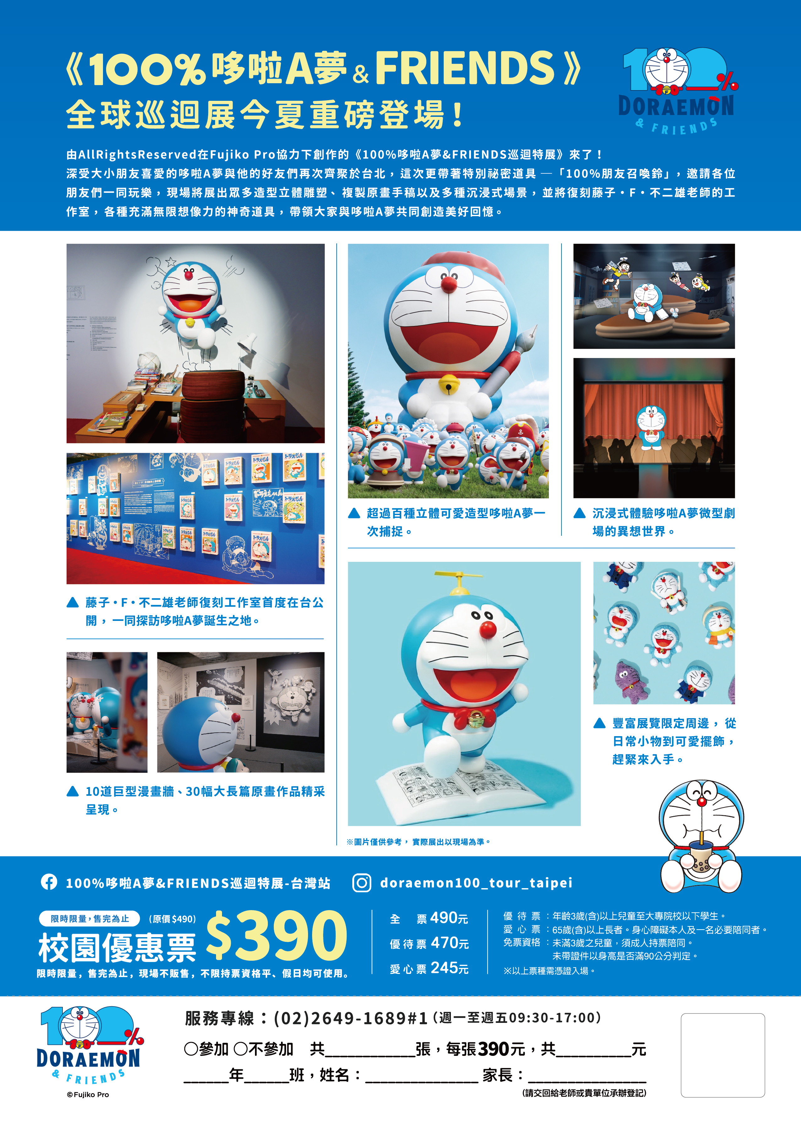 一、《100%哆啦A夢&FRIENDS》全球巡迴展今夏登台!深受大小 朋友喜愛的哆啦A夢與他的好友們再次齊聚於台北,這次更 帶著特別祕密道具─「100%朋友召喚鈴」,邀請各位朋友 們一同玩樂,現場將展出眾多造型立體雕塑、複製原畫手 稿以及多種沉浸式場景,還將重現藤子・F・不二雄老師的 工作室,以及各種充滿無限想像力的神奇道具,帶領大家 與哆啦A夢共同來創造許多美好回憶。