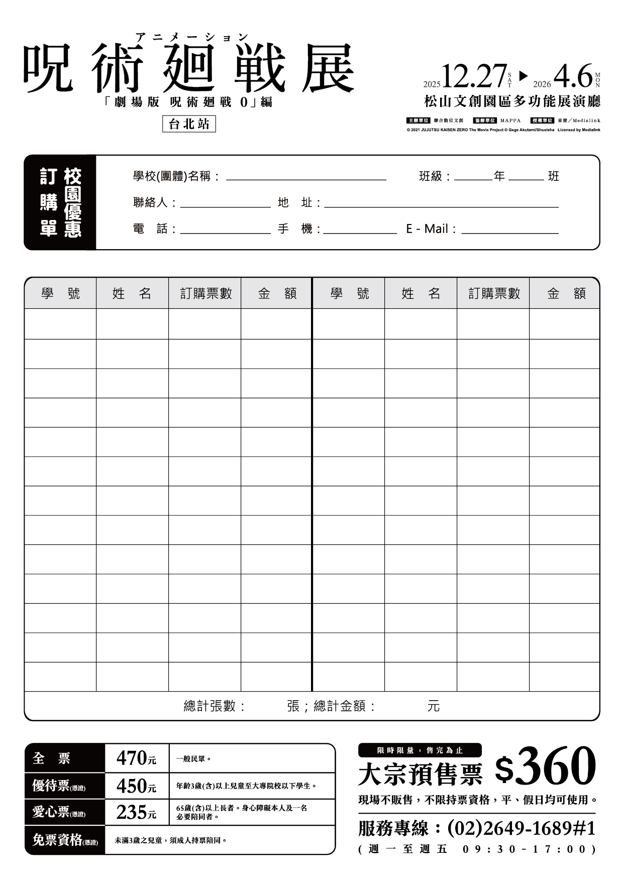 七、本案聯絡人:活動推廣部校園優惠票服務專線:(02) 2649-1689#1(代表號)服務時間:周一至周五09:30-17: 00。