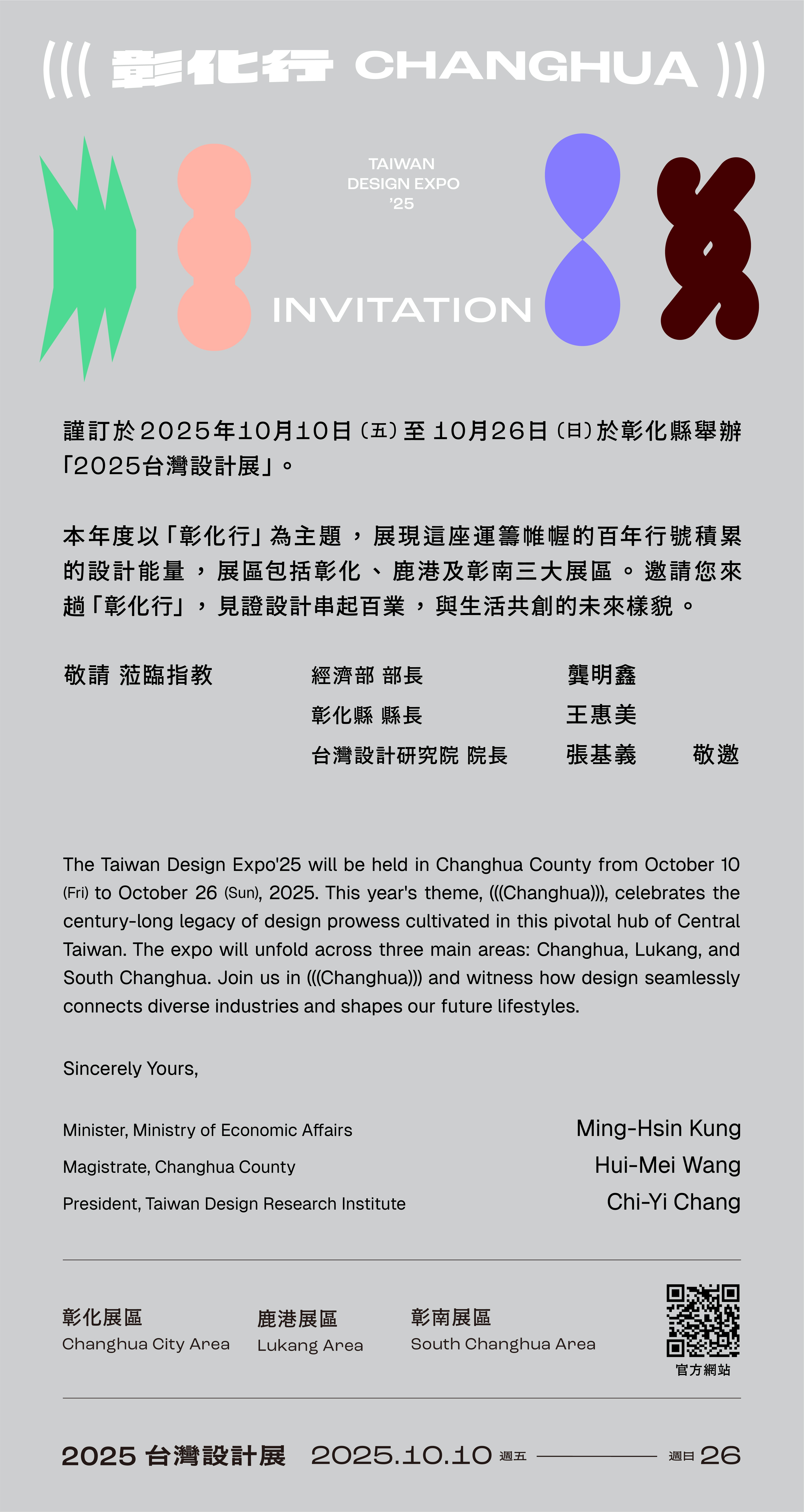 二、2025台灣設計展主題為「彰化行 (((CHANGHUA)))」,由設 計師聶永真操刀,匯聚700位設計師、1,640家廠商及600家 在地店家參與,展覽橫跨彰化、鹿港、田中、田尾等地, 規劃三大展區與15個主題展,完整呈現彰化的產業、文化 與創意。展區參觀時間為每日上午10點至下午6時,週五週 六延長至晚間8點。