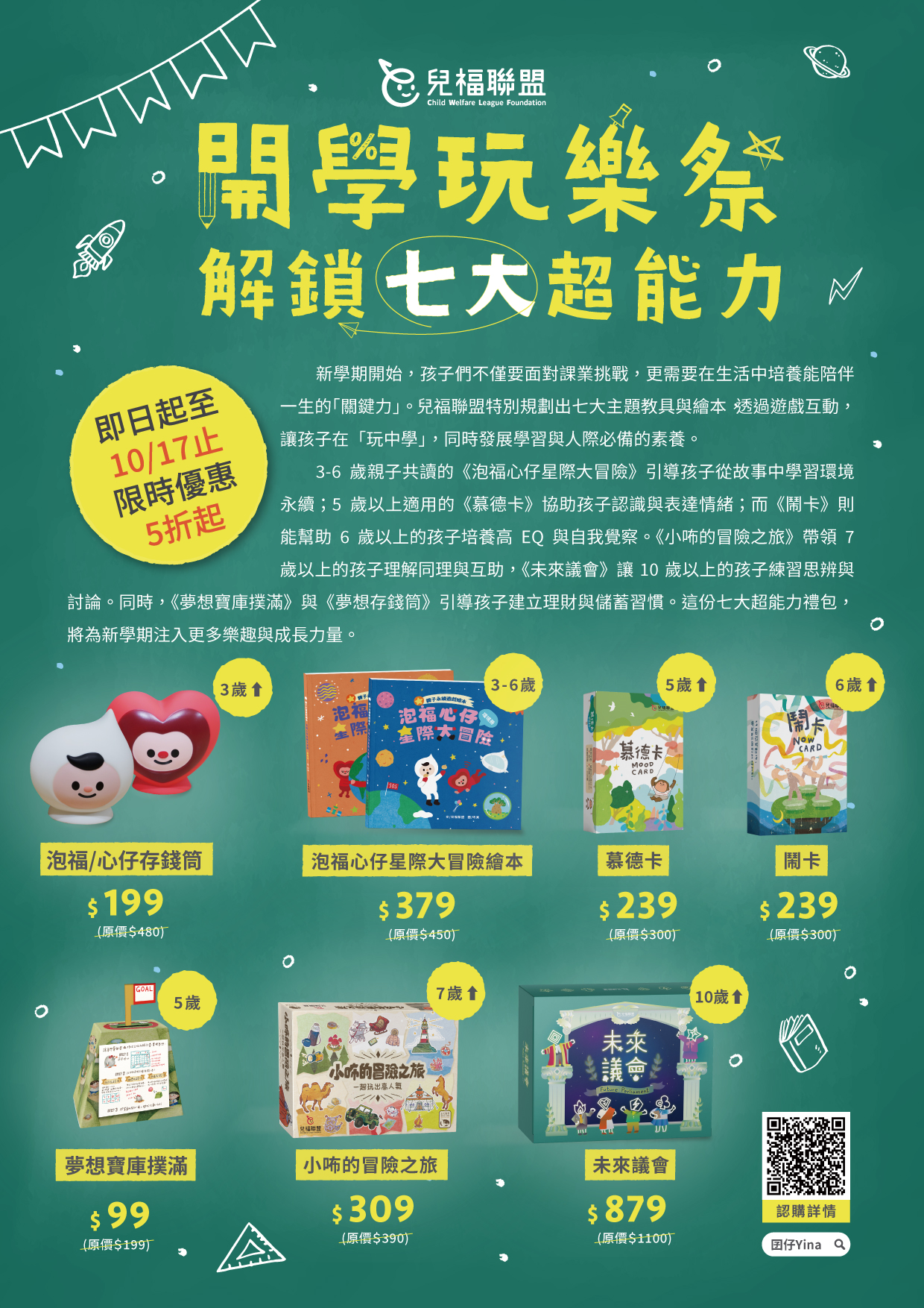 一、本會長期關注兒少身心發展,為協助孩子在新學期能兼顧 知識學習與生活素養,特規劃「開學玩樂祭·解鎖七大超能 力」成長禮包,透過繪本、桌遊及互動工具,引導孩子在 遊戲中培養未來關鍵能力。